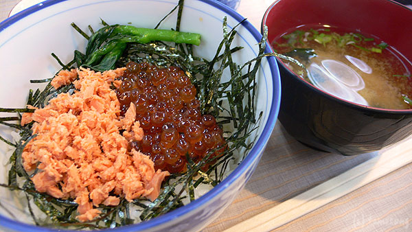 他の人達は少量ながら美味しそうな海鮮丼を食べている。自分だけ笑われながら鮭フレーク。お茶かけたろか?