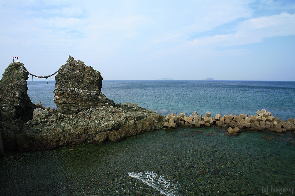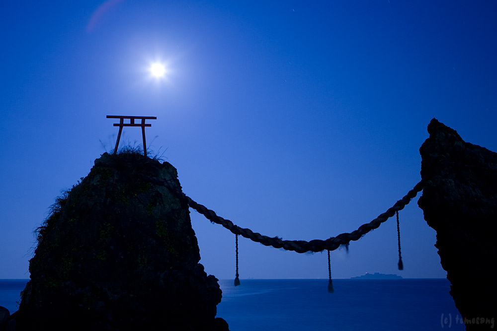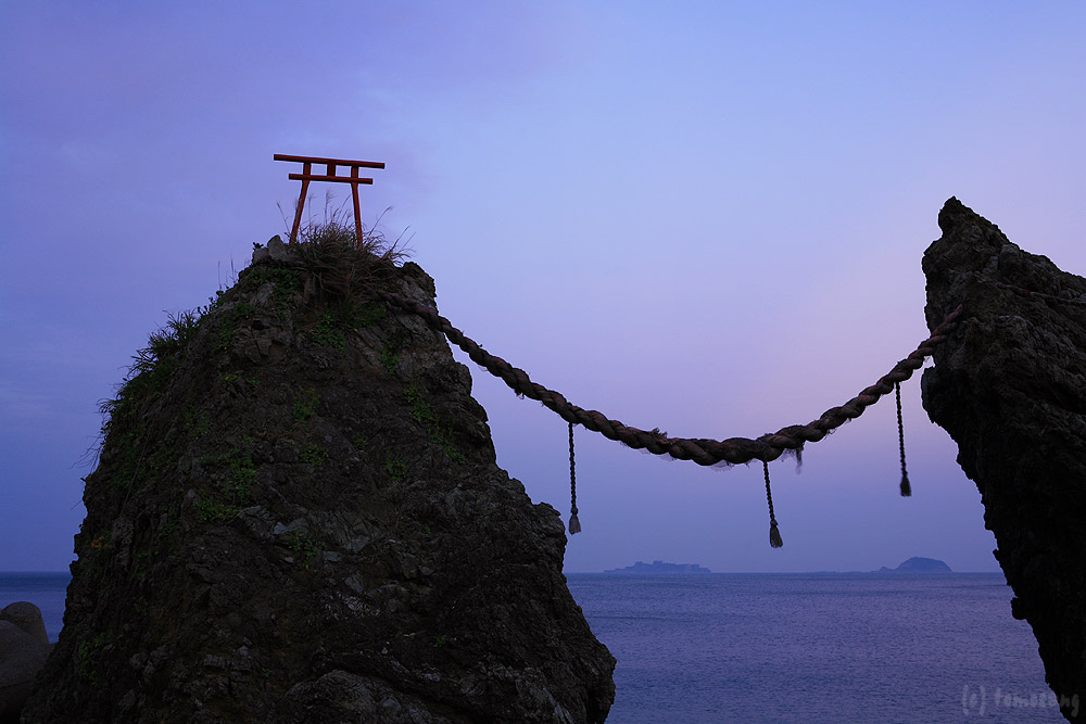 夫婦岩の間に軍艦島を配置して撮影してみる。
