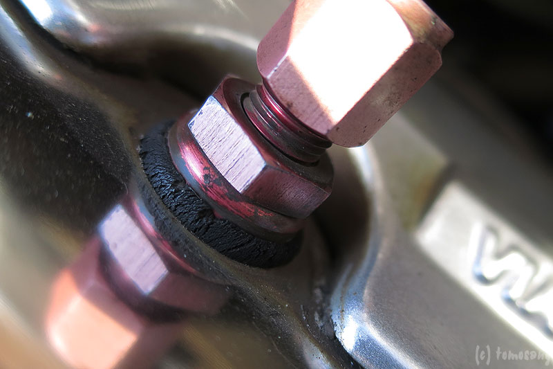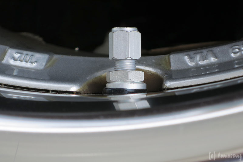 このような状態につき、一本からエア漏れを起こしてました。タイヤの空気圧が落ちていた原因は、乗らずガレージに放置しているからだけではなく、こんな所にも原因があったのでしょう。