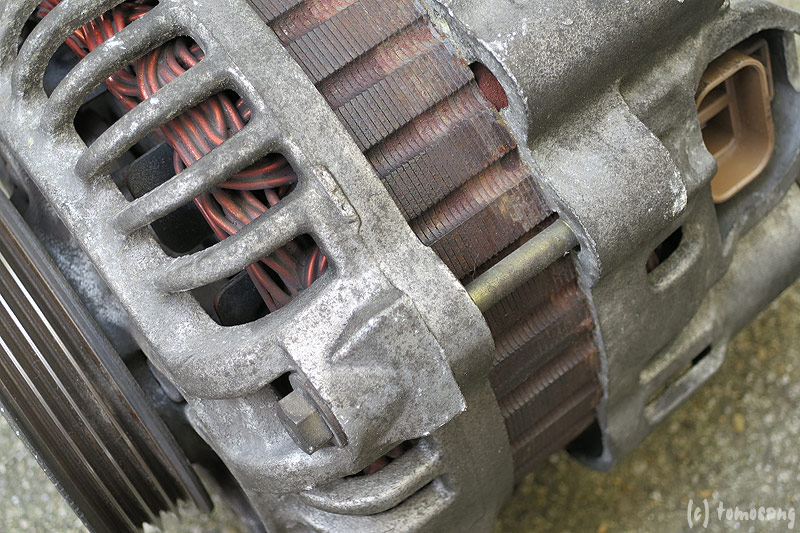 もしかしたらこの時点でオルタネーター本体が落ちてくるかもしれないので、片手で本体を支えておく。一度も交換していないのであれば固着していて外れないと思う。上からバールでこじって落下させた。プーリーに傷が入ったが、コア返却に際して傷を入れるなとは書いてなかったので問題ないなかろう。
