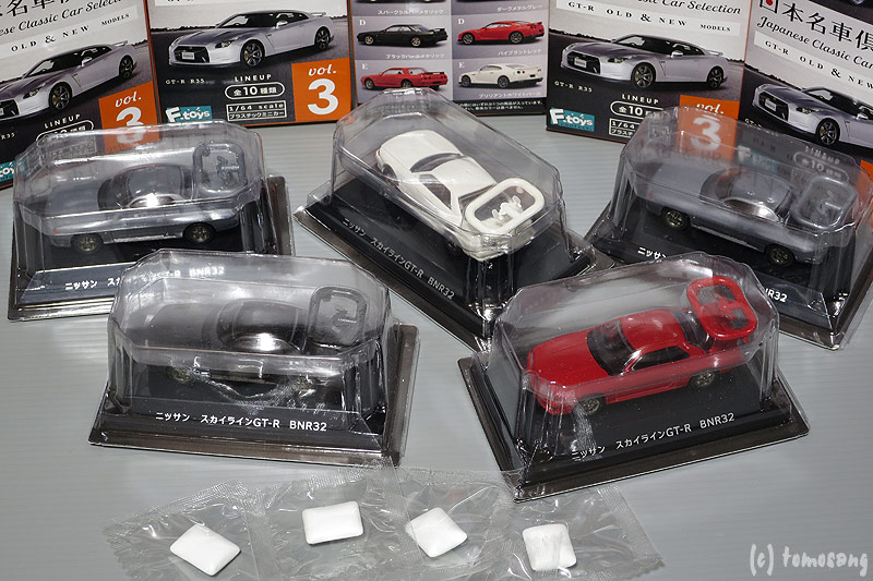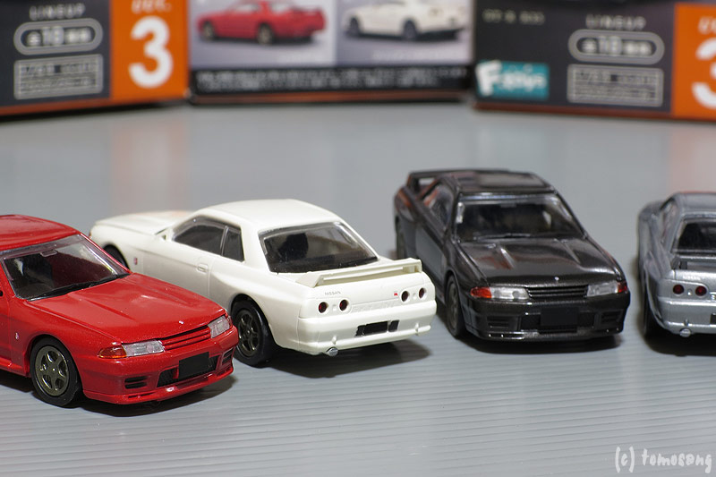 前回の【ニッサンスカイラインGT-R R32栄光の軌跡】と同じメーカーのもの。SKYLINE GT-Rと、そうでないGT-R各5色。スカイラインであるかそうでないかは、外箱に番号が載っているので、要らない方を手にする心配はない。