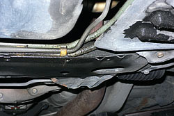 漏れている場所は、タンクから下に伸びてる配管のゴムと金属のジョイント部分。クランプの増し締め対応は、既に前回の車検時にしてるので今回は不可能です。写真も撮ってみましたが、カバーがあってよくわからないと思う。