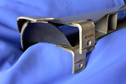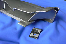 破片が見つかった部分は瞬間接着剤で復活。丸ごと行方不明の上の部分はホームセンターにて汎用ステーを買ってきて加工して装着。少し塗装もはげているが、ボンネットを閉めれば見えなくなる部分なので助かった。