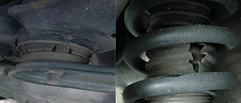 久しぶりのリフトアップなんで、交換中にリフトの下に潜り込んだりして各部チェックしました。メンバーブッシュが割れてます。これはカラーで固定してるからあまり気にしなくても良いでしょう。ショックのダストブーツが破れ始めてます。タイラップでも軽く巻いておけば暫くは砂が入ってくることは無いでしょう。暇を見つけて傷口を塞いでおきます。