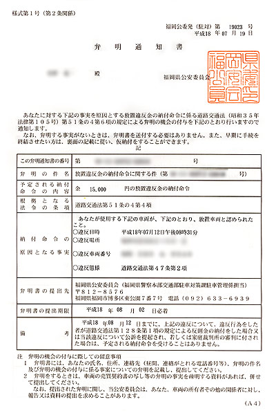 弁明通知書とは、売買などで所有者が変更になっている場合に「弁明する機会を与えますよ」といった感じだと思う。期限は8月2日(違反日から約3週間)まで。それまでに売買契約を立証すれば、名義変更が完了して無くても違反金は免れ、新たな所有者へ納付命令が行くということか?