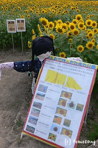 わからないように撮影してますけど、畑の中は通路があり迷路になっています。途中にクイズの書かれたプレートが立ててあり、正解の方向に進むとゴールへ行くことが出来る。外れると行き止まりで案山子が立っていた。