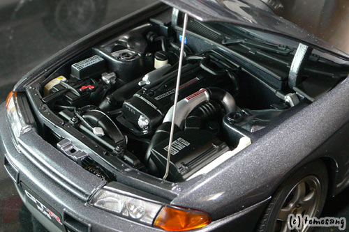 「AUTOart R32GT-R V-spec II」のエンジンルームと比べるとわかりますけど、ちゃんとABSユニットが外されています。タービンやクラッチまではわかりません。