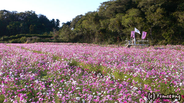 洗車をして給油に向う途中、ピンクな西郷川花園が目に入る。なぜかまたコスモスが満開になってます!