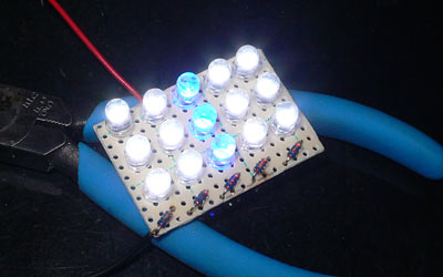 まずは電球のはまる部分のサイズを測り基盤をカットします。参考までに25mm×38mmでした。そしてLEDをはめて半田付け。スペース的に5mmLEDは15発はまりました。