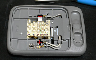 極性は以下の画像の通り。車両装着して通電してみると、半田部分が縁の金属に当たっててショートさせてしまいました。よって両端のみ絶縁テープを貼っておきました。