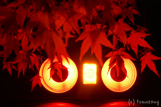 少しハレーションを起こしている。いつもならある方法でテールライトを綺麗に写すのだが、この状況でそれを実行すると楓の葉まで暗くなってしまう。楓の葉はライトの透過光で浮かび上がらせて撮影しているから。