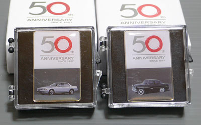 歴代スカイラインの写真と50周年記念ロゴのピンバッチです。