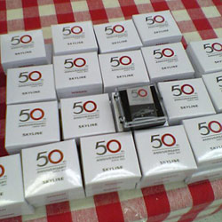 ディーラーでアンケートに答えると、スカイライン50周年記念ピンバッチがもらえるということを最近知った。早速もらいに行ってきました。