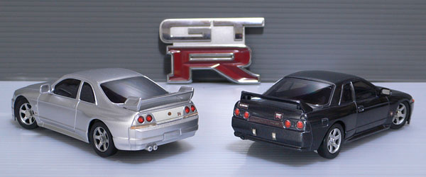 R32はまあ良しとして、R33はライトが前期になってます。パッケージでは後期プロジェクターなのに。小さなシールを時間をかけて綺麗に貼り付けて完成。指の爪を切った直後だったので少し大変でした。
