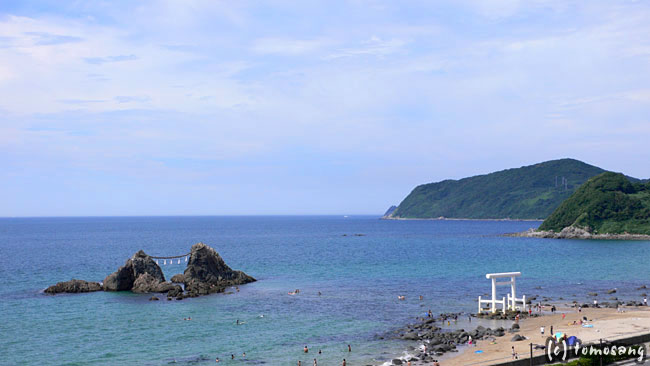 そして夫婦岩に到着。これは雑誌で見て知っていました。しかし海水浴場になっているとは思いませんでした。若い水着!!!!!写真撮り難いじゃん。C-PLフィルター付けたレンズの一眼なんて、一般の人から見たら怪しいよ(それでも撮ったけど(笑)webに載せるのはこんな写真にしておきます。