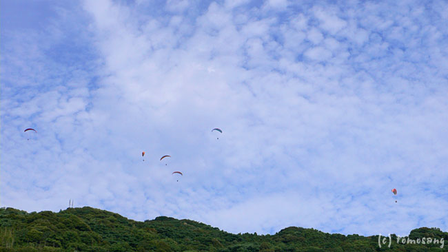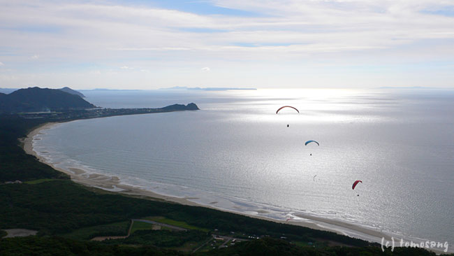 以前何かの本でこの辺一帯の海岸線を山の上から見下ろし撮影した写真を見たことがあります。どこで撮影したものかと地図を眺めながら彦山を抜けてみたけど違う。海岸沿いの道を走行していたらパラグライダーが飛んでいるのが目に入る。地図で確認すると火山。一応道もあるみたい。ということで行ってみた。