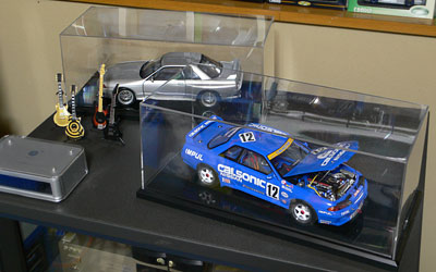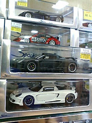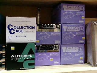 長居すると危険なので目的のケースを探しに店内をうろつく。ディスプレイケースはこの店にも売ってなく、一台ずつ飾るコレクションケースを買う事にしました。それでも何種類か在庫があり値段もそれぞれ。背面にミラーシートが付いているケースがいいなと思ったものの、お値段約1800円。結局一番安い(1200円)ケースを4個買って帰りました。