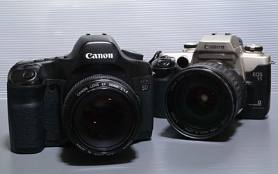 奥がフイルム機のEOS 55で、手前がデジタル機の5D。ともに「5」