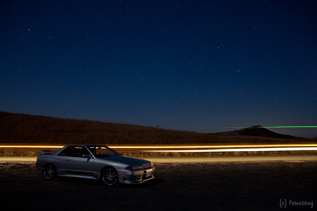 通過したのがトラックだったので緑のマーカーランプが邪魔くさいです(笑)普通車の通過を待ってましたけど、写真でいうところの左側からばかり来ます。右側から来ないとフロントには光りが当たりません。待っている間に空が明るくなり始めたので諦めました。