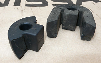 切れていたブッシュを外してみると、切断面は何かに引きちぎられたような感じ。タイヤ止めにぶつけた時に切れたのか。原因は不明。