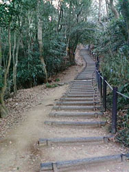 神社を過ぎて少し行くと道は階段になる。この階段を登り切ると山頂に到着。所要時間は、猫と戯れた分を引けば30分位だと思います。