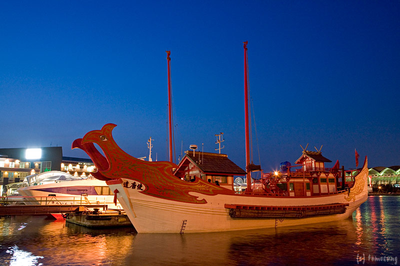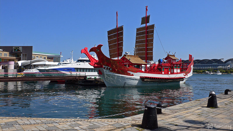 「遣唐使船再現プロジェクト」により復元され、中国の上海万博へ向かう途中の遣唐使船がベイサイドプレイス博多埠頭に寄港。ちょっと見に行ってきた。