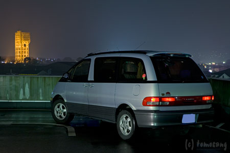 26日、買い物のためイオンモール・ルクルへ向かっていると、志免立坑櫓がライトアップされているのに気がついた。タイミング良く他の用事で使うためカメラを積んでいたので、屋上駐車場へ上がりスロープから撮影してみた。