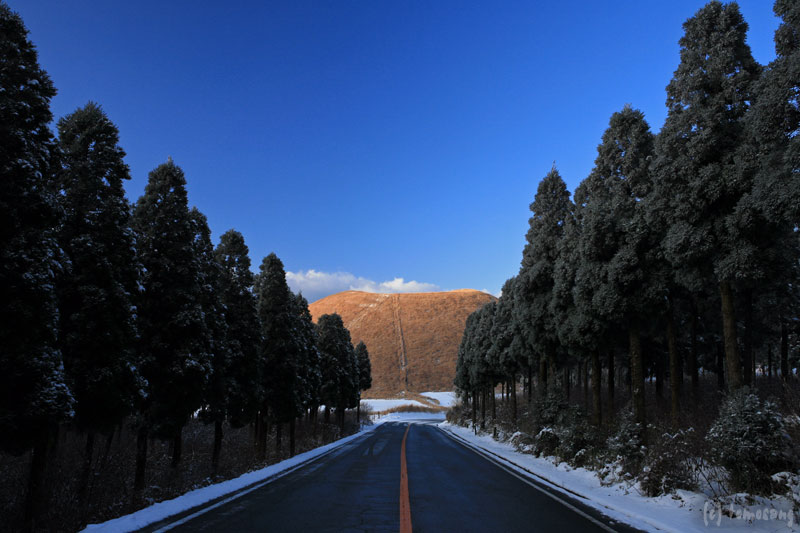 いつもは大分自動車道・日田ICから一般道で小国を抜けて阿蘇へ入る。前日に日田からの雪情報が入って来ていたので、この日は九州自動車道・熊本ICから国道57号を利用して阿蘇に入った。