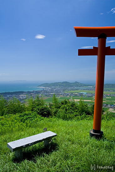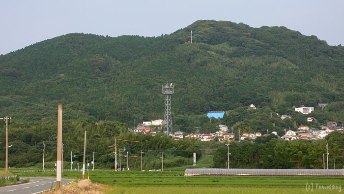 近付いて撮影してみる。山の上のアンテナ下にある赤と灰の鳥居が並ぶ場所が展望所。
