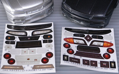 R32はまあ良しとして、R33はライトが前期になってます。パッケージでは後期プロジェクターなのに。小さなシールを時間をかけて綺麗に貼り付けて完成。指の爪を切った直後だったので少し大変でした。