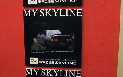 日産自動車栃木工場40周年記念、そしてスカイライン50周年として「50」の人文字ならぬ車文字を作ったり、工場ゲストホール内に「My SKYLINE」というコーナーを設置、スカイライン・オーナーの声を愛車の写真と共にパネルに掲載して公開といったことが行われました(他にどんなことやったのかは知りません(^^ゞ)。