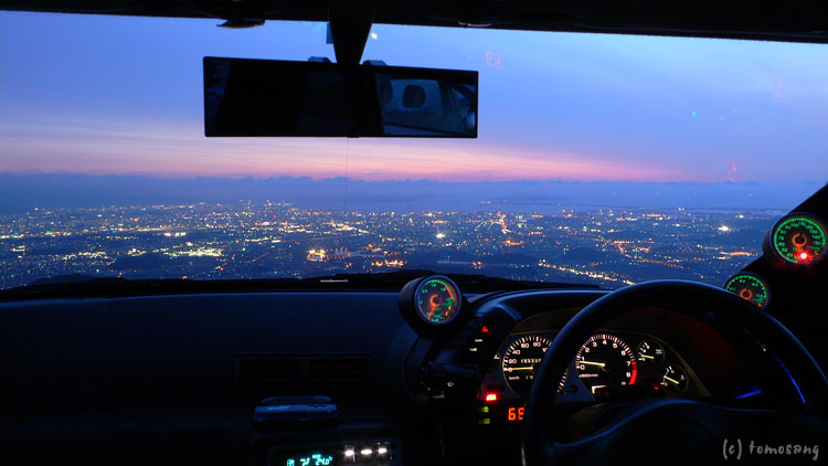 この写真、もう少し暗くなって街のイルミネーションが増えた頃に撮影したものを使うつもりでしたけど、PCのモニターで見るとバックミラーが恐かったのでボツにしました。隣車のシートが写ってることから察してください(笑)