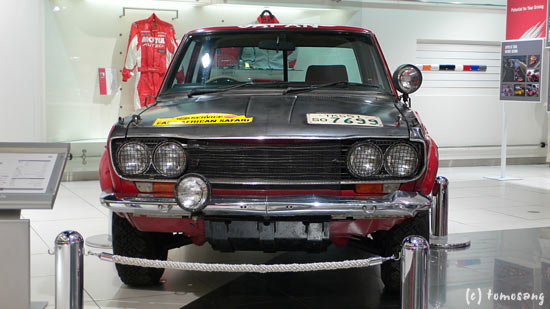 昭和45年(1970)の第18回東アフリカサファリラリーで総合優勝を果たしたマシンです。昭和38年の初参加から8年目、総合・クラス・チーム優勝の完全制覇でした。3代目ブルーバード(510)のデビューは昭和42年(1967)8月。'69年・第17回サファリラリーを舞台にした映画「栄光の5000キロ」(石原裕次郎主演)は有名です。