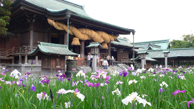 「菖蒲まつり」の垂れ幕が目に入ったので少しばかり寄り道。九州では唯一の江戸菖蒲の菖蒲園を持つ、福岡県福津市「宮地嶽神社」の花菖蒲苑。5月31日~6月10日まで、境内で「菖蒲まつり」が開催されていました(文言:ふれあいサロン館より)。