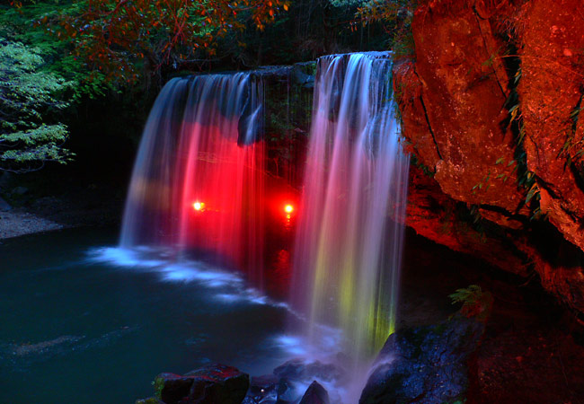 さて、今回阿蘇へ出向いた一番の目的、小国町にある鍋ヶ滝のライトアップです。
