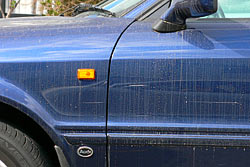 私の32は屋根付車庫に入っているので、ここまで酷くありません。風に飛ばされた分が付着する程度です。しかもシルバーなのであまり目立たない。急遽よそ様の車に登場していただきました。