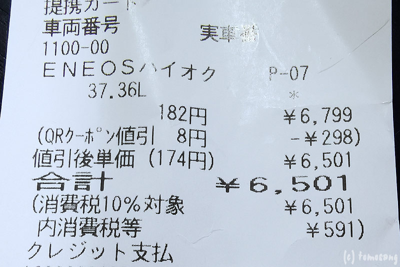 ポイント使いリッター10円引きでこれ。ガソリンの高さに驚く。