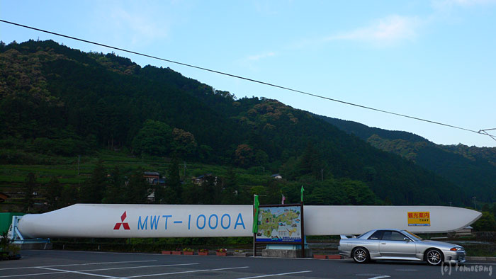 暫くすると今度は右手の山の稜線に大量の風車群が見えてきた。そこでやっと羽の展示してあった意味がわかった。そのまま暫く走り続けていると誘導標識が出ていたので、その方向に曲がってみた。距離にして約10kmと出てたものの、山道(舗装はしてある)なので随分と長い道のりに感じ、いつになったら到着するものかと。デフ入ってて良かった(謎)