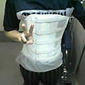 採型は体に石膏を塗って型を取るのかと思えば、包帯の様なものに水分を加えて体にグルグル巻き付け、それが数分したら固まり出来上がり。作業は10分程で終了。簡単なんですね。