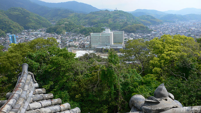急な石段を上って天守閣へ。階段のきつさと蒸し暑さに、広場に出た所で天守閣を前にしばらく休憩。
