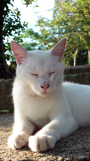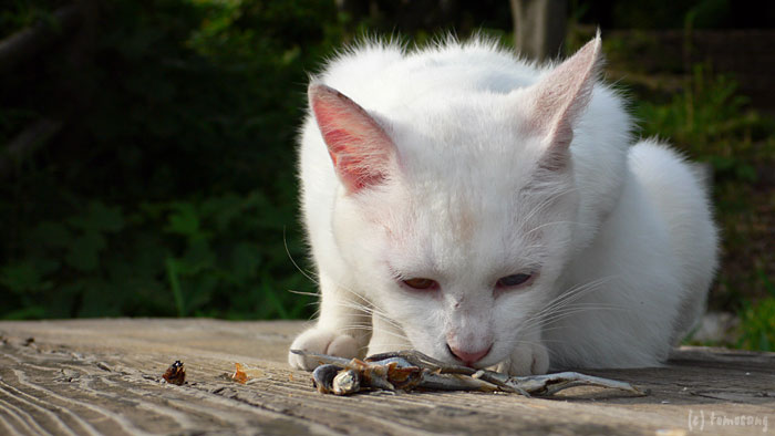 昔から住み付いているグループには入ることが出来ず、いつも一匹でうろついている。この公園には住み付いている猫へ餌をあげに来ている人がいるようだが、こいつはグループに入れないのでいつも餌にありつけないでいる。かわいそうなのでたまに餌をあげに行っていたら、完全になついてしまった。