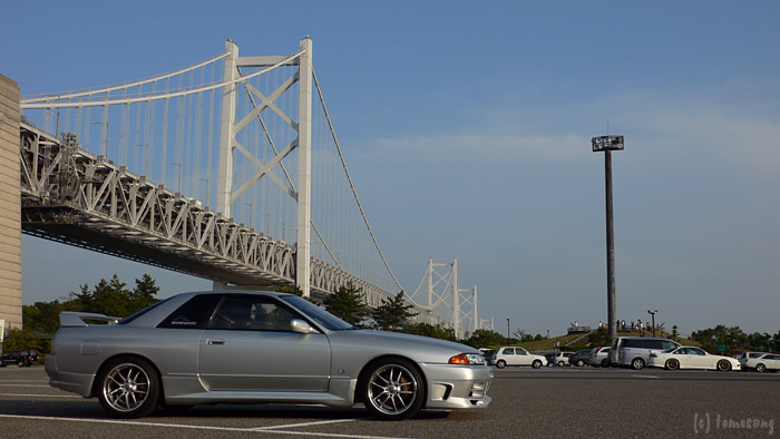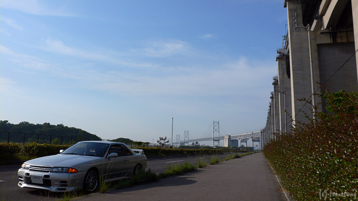 駐車場に入ろうとしたら暴走族の集会があっていて、とんでもない数のバイクが止まっていたので、通過して奥まで行くと海沿いに出て橋を見渡す事が出来ました。