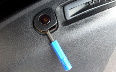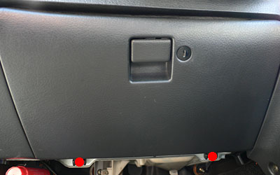 まずはグローブボックスを外してコネクタの位置を確認します。外し方は赤点箇所にあるネジ2本を外して、グローブボックスをあければズトンッ!と落下して外れます。