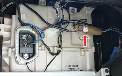 どうしても判らない場合は、先にダッシュボード上部側のセンサー本体を外し、上に引いてみれば、下で動くハーネスがあるので、そのコネクターを外せばよい。