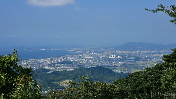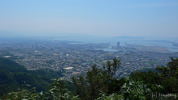 右に木の間から古賀市~福津市。