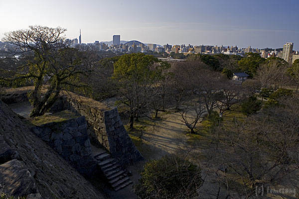 【舞鶴公園へ】で梅を堪能。天守台にカメラをセットして日没を待つ。