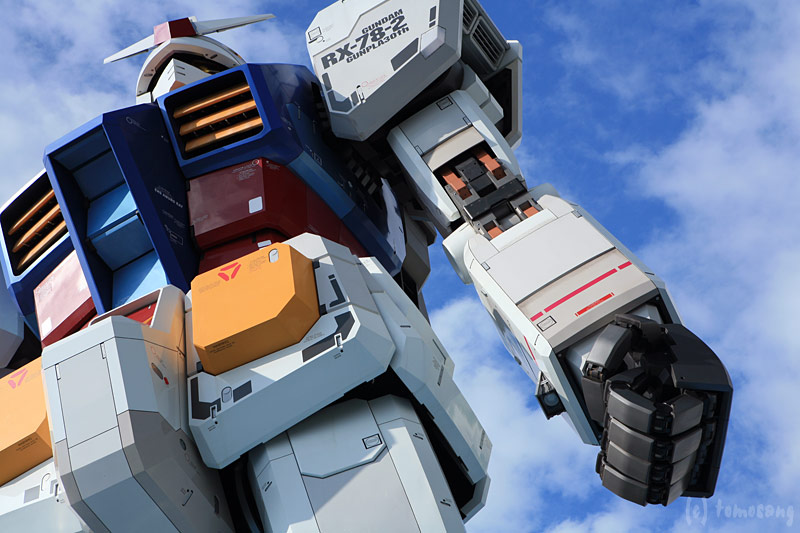 足元まで行って実際にガンダムを触る事が出来ると言う事で、行列に並ぶ。とは言っても一グループ分待っただけで自分達の番に。さて台に上ろうかと思ったら、定時パフォーマンスというものが行われるらしく、足元で暫く待たされる。何があるのかとカメラを動画モードで撮影していたのだが・・・首が左右に動いただけでした。