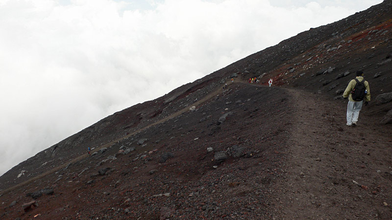 ジグザグ単調な道です。ガスっていて景色があまり見えないので黙々と下るだけ。次第につま先が痛くなってくる。須走の砂走の方が楽でした。