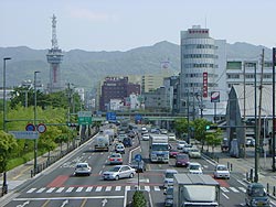 ■10号線。左に別府タワー、右にトキハ。この写真は「栗八羊羹」さんの真似であります(笑)