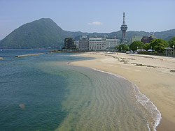 ■的ヶ浜スパビーチ。左奥に見えますのが、猿で有名な高崎山です。今月31日に花火大会があります。